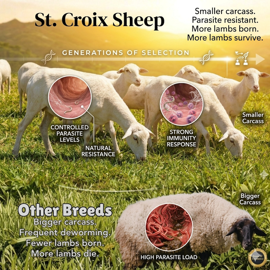 Cleaner Pastures: That 99% reduction in egg shedding means St. Croix sheep act as natural pasture vacuum cleaners. They eat the larvae but don’t poop out new eggs, actively cleaning the land they graze on rather than contaminating it.